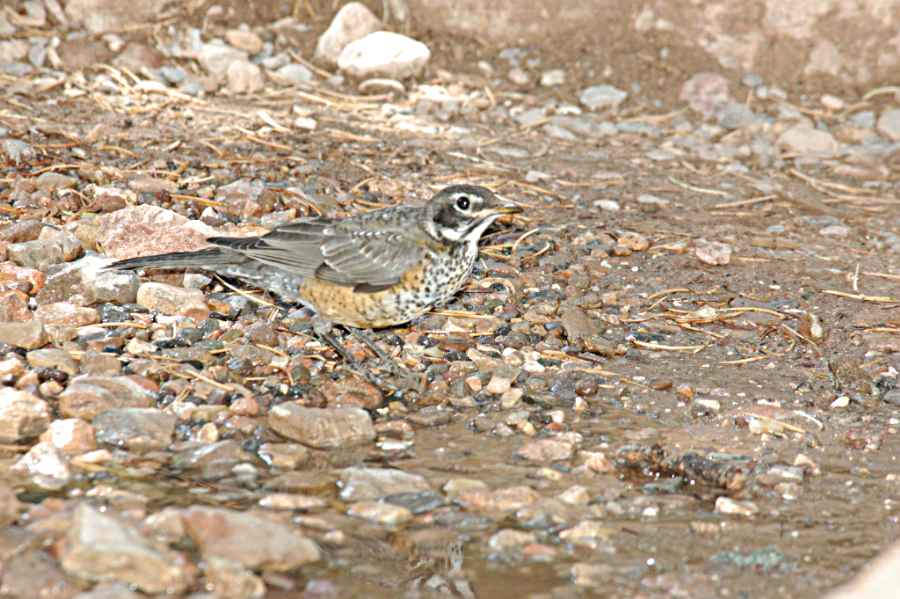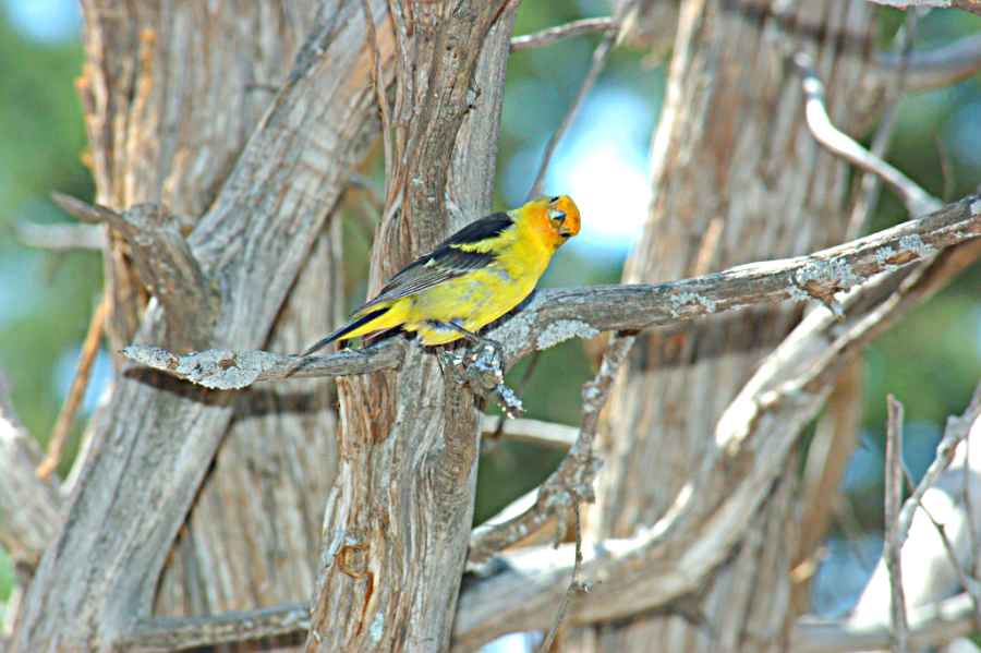 Lurking in the branches of the tree right over the dripping fountain, I believe it is going to come down and drink.
