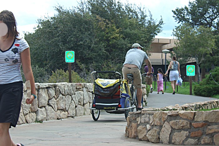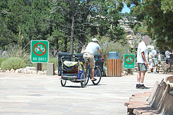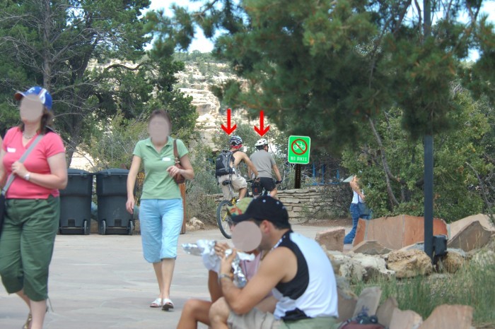 Note the 2 red arrows. They be lookin at the NO BIKES sign maybe they can't read, or just don't know what it means.