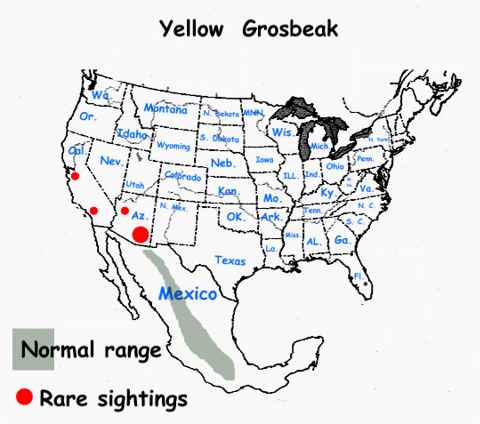 This is primarily a Mexican bird. Occasionally is found in south eastern Arizona in the early summer. Not the very large bill. The female is much duller and the top of their head has streaks in it. The photos here are of the male Yellow Grosbeak .