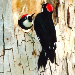 Which one do you think is the male Acorn Woodpecker, and which one is the female Acorn Woodpecker?