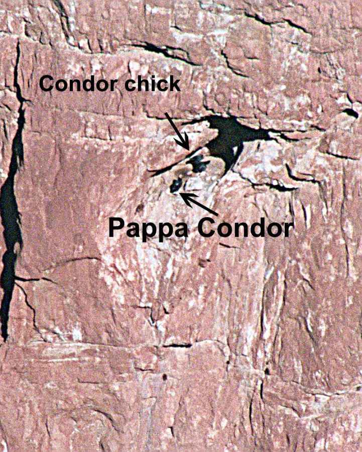 Last year a nest here failed. The park biologist repelled down some 170 feet or more to this cave entrance to see what possibly may have gone wrong. Remains found in the nest cave were from the Pleistocene area which in geologic terms is from 10,000 to about two million years ago. The juvenile and adult condor remains were Carbon 14 dated from 11,000 to 23,000 years ago. Remains of of at least three extinct mammals were also found in the cave, an extinct horse, bison, and brush ox.
