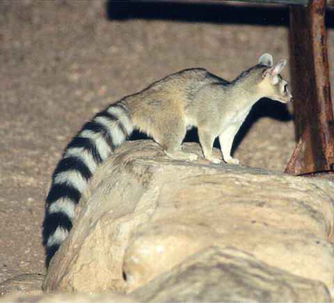 It can be up to approximately 3 feet long. It's sort of a gray-yellowish on the top side of the body, but much lighter on the under side. They call it a cat (ringtail) because its body resembles a cat's body, but has a face sort of like that of a fox. The tail is the most out standing thing about this animal, note how bushy it is. Also note the black rings on it. This one only has 7 rings on its tail. The books say it can have as many as 16. The tip is always black. If you were to turn the Ringtail over you would see that the rings on the tail do not meet on the under side. Please note the extra large eyes and ears, this is all the better see and hear you with. If you closely you can see a very pale eye ring, very light in color. There are 5 toes on each foot and I do not believe there is any difference in its foot prints from the front feet to the back feet. You may never see its tracks because it for the most part it lives in very rocky terrains. Inasmuch as I photographed it at the South Rim of the Grand Canyon right on the very edge proves its habitat as stated. The Ringtail sleeps by day and hunts it prey at night. It eats grasshoppers, crickets, very small mammals, small birds, spiders, and frogs if it can find any.