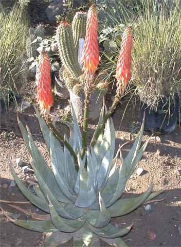 Aloe is widespread from South Africa to Arabia in sizes from 1 inch to 25 feet plus. There are approx. 300 species of the Aloe. The Aloe is often confused with the Agave.