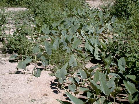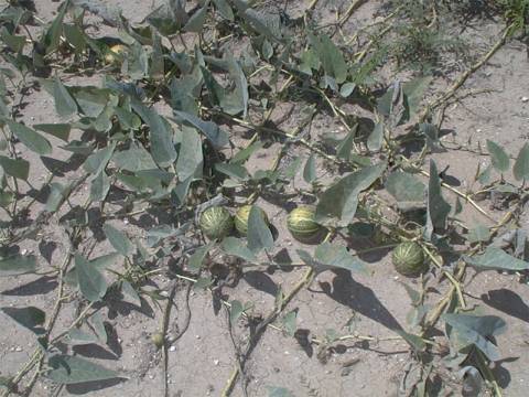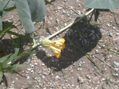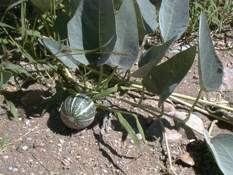 Grows along streams and on desert sandy flats. Some are so large they look as if they are taking over every thing. Very large green-grey triangular leaves. Has a large yellow funnel shaped flower. produces a small 2-3 inch miniature watermelon looking gourd which turns bright yellow when ripe. It's been said that the roots of some of the very large plant weigh 100 plus pounds. The melons are not eatable and are poisonous to some. I have been told the the Coyotes do eat them, but I have never seen this happen. Flowers April - July.