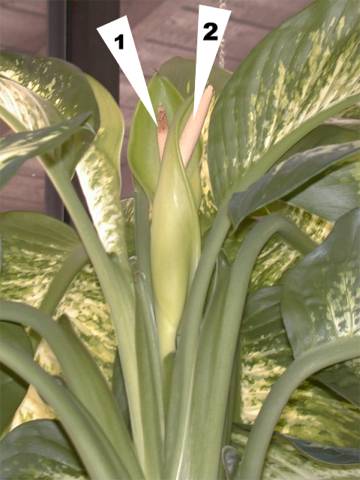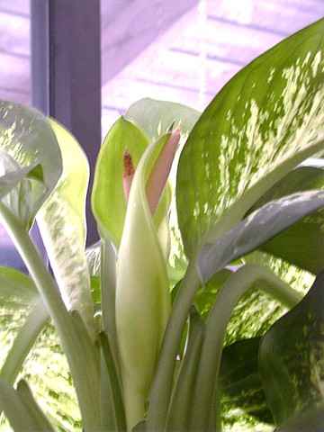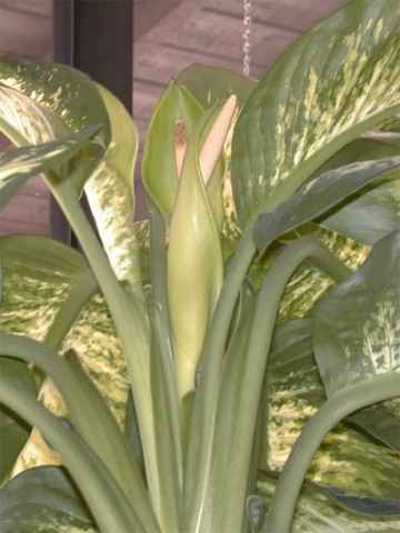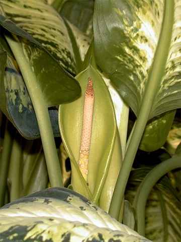 Now, I have probably seen hundreds of these plants in my life time, but never one like this one. After looking at it for quite some time I notice a most remarkable thing, it was blooming. At first I did not believe what I was seeing. I thought some one had just put these blooms on the plant. Who ever herd of a Dieffenbachia blooming? I got a 4 foot step ladder, and I climbed up so I could be within 12 inches of the bloom. Sure enough, it was a real Dieffenbachia bloom growing right out of the top of the largest stem, in fact there two blooms growing out together or side by side. As I was about to clime down off the ladder, I noticed one other very tall stem had a bloom growing out of the top of it. Just in case you don't believe me, here are a few digital images that I took.