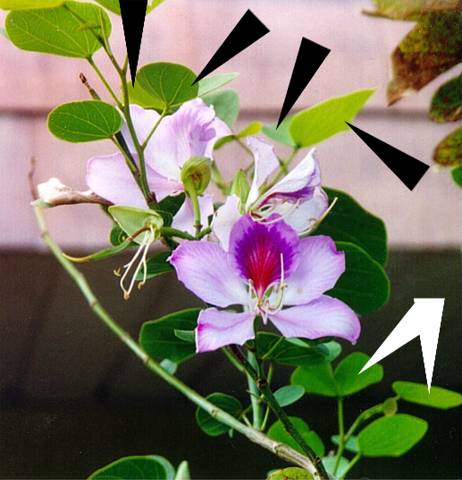Common to all garden bauhinias are twin leaves, actually twin lobes.