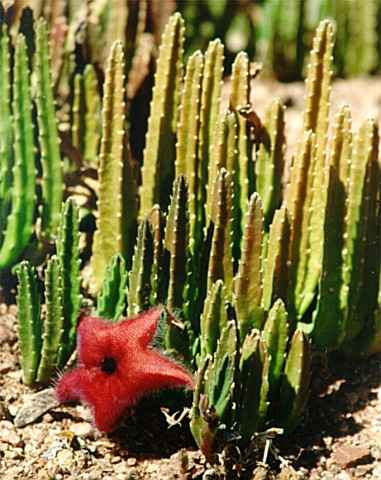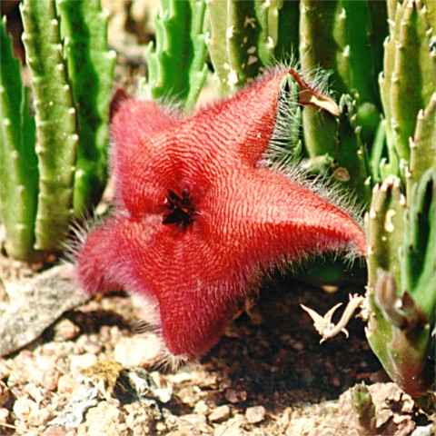 A very foul smelling flower, which gives these flowers or carrion plants the name of Star Fish Flower. South Africa, but very easily grown here in the U.S.. Some 100 species. Blooms are always 5 pedals. Colors range from mustard to deep maroon and most always appear at the base of the stems. Blooms can be as large as 10 to 12 inches across.